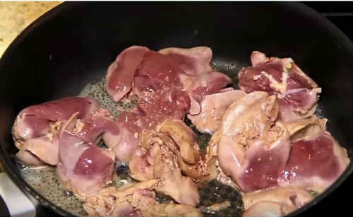 - Окремо обсмажте шматочки субпродукту, попередньо вмочивши їх у борошно.