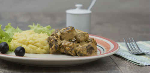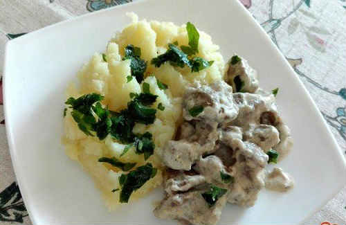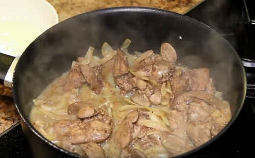Куряча печінка з грибами в сметанному соусі