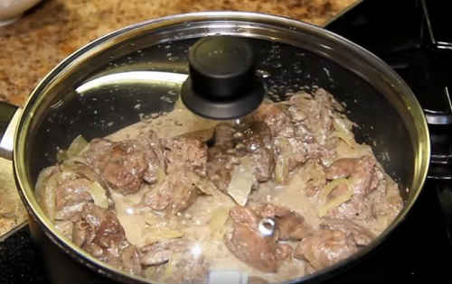 - Залийте страву сметаною, здобріть приправами, підсолити і відкоригуйте смак. Продовжуйте тушкувати при тихому кипінні протягом 15 хвилин. Тримайте кришку закритою.