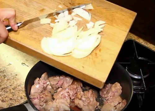 - Одночасно обсмажте на іншій сковороді цибулю, покришений довільно. Перекладіть до печінки.