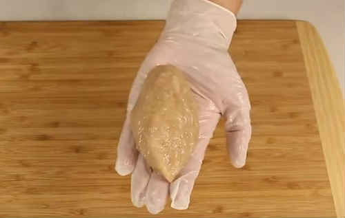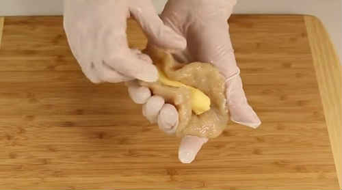 - Візьміть на долоню шматочок фаршу, розплющить в коржик. Покладіть в середину брусок сиру. Накрийте сир фаршем, надійно скріпивши краю.