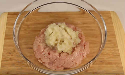- За допомогою м’ясорубки або блендера перетворіть куряче м’ясо у фарш. Дуже дрібно покришіть цибулину, відправте в м’ясо.