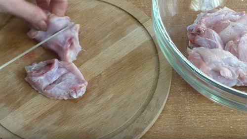 - Розріжте крила по суглобам на частини, складіть в миску.