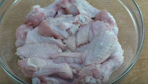 - Обполосніть курку, поділіть на частини (беріть плече і другий суглоб).