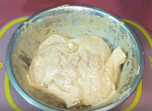 - Спочатку зробіть маринад для курки. Для цього з’єднаєте в посудині сметану з майонезом, додайте всі перераховані в рецепті приправи, підсолити соус. Ретельно перемішайте вміст.