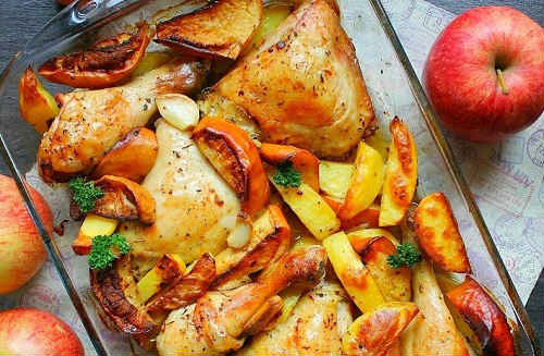 Ідея належить до Середземноморської кухні, там курка з овочами в особливому маринаді неймовірно популярна. Чудовий маринад з чебрецем та іншими приправами, зробить смак курячого м’яса незабутнім. Для приготування беріть стегенця невеликого розміру.