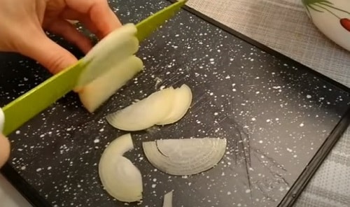 - Нашаткуйте цибулю четвертинками кілець. Покришіть печериці пластинами (не дуже дрібно).