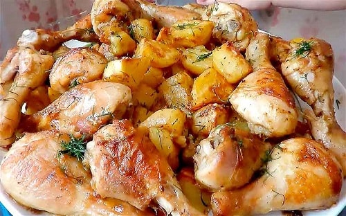 Я не даремно назвала цей рецепт кращим, оскільки куряче м’ясо запікається з дуже смачним маринадом. А на картоплі ви побачите всіма улюблену хрустку скоринку. Виходить ситне блюдо з гарною подачею, гідне святкового столу.