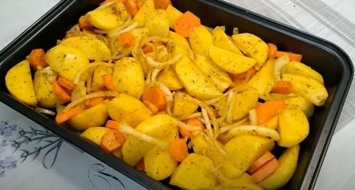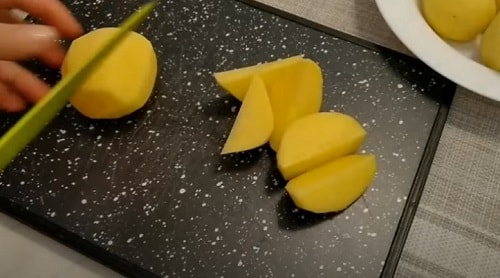 - Почистіть картоплю, поділіть великими часточками. Полийте нарізку маслом, посипати приправами, зазначеними у складі рецепта. Розмішайте.