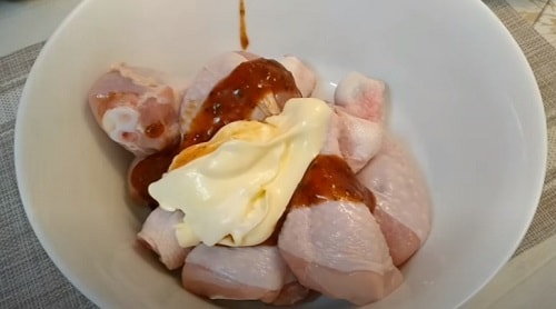 - Помийте ніжки, складіть у глибоку ємність. Відразу підсолити, здобріть перчиком. Покладіть подрібнений в крихту часник. Викладіть приблизно 170 мл майонезного соусу, залишивши частину для картоплі.