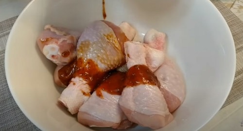 Обполосніть гомілки, просушіть паперовою серветкою, складіть у зручну посудину. Полийте соєвим і томатним соусом.