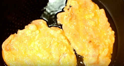 - Налийте на сковороду достатню кількість масла, щоб при смаженні відбивна була покрита не менш ніж на третину. Добре розжарте його, тоді кляр відразу «схопиться» і курка вийде соковитою.