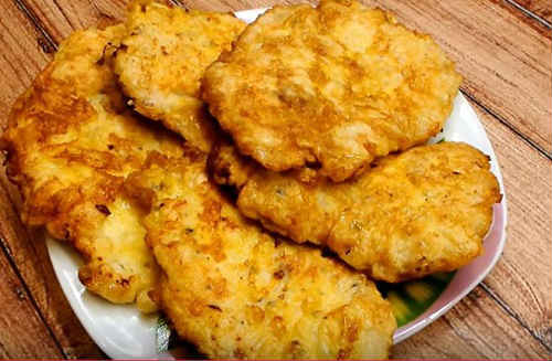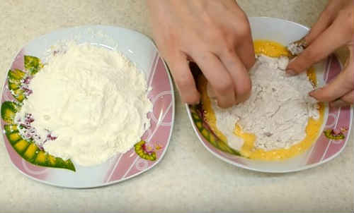 - Далі все за перевіреною технологією: в одній мисці збийте яйце. в іншу насипте борошно. Вмочайте заготовки по черзі яйця і борошно. Смажте з обох боків до рум’яної піджареної.