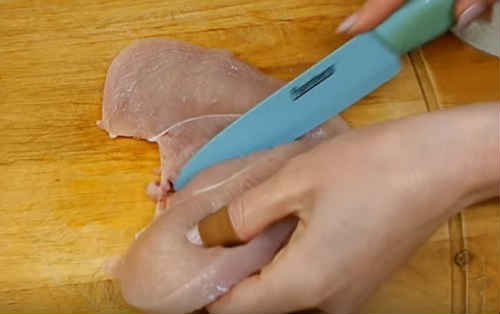 - Розріжте цілісну курячу грудку на половини, потім уздовж тонкими шматочками.