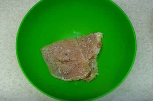 - Помийте і обсушіть курячу грудку, розріжте на порції. Злегка відбийте, перетворивши заготівлі тонких відбивних. Посипте приправами з пакетика, трохи присолите. Маринуйте протягом півгодини.