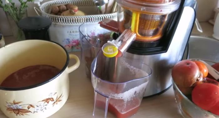 6. Готуємо томатний сік, пропустивши помідори через соковижималку. Наливаємо літр соку в каструлю, солі, сахарим і ставимо на вогонь кип’ятитися.