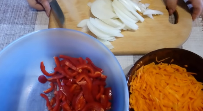 3. Моркву тремо на крупній клітинці терки, перець нарізаємо тонкими слайсами, ріпчасту цибулю шаткуємо півкільцями.