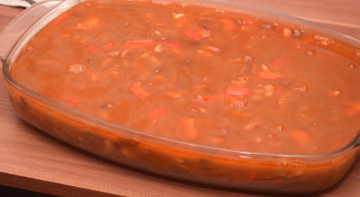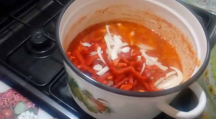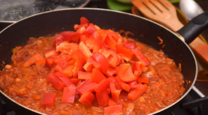 4. Коли томат добре прогріється, в зажарку наливаємо пару ополоників гарячого квасоляного відвару (можна використовувати звичайну воду), доводимо до закипання і додаємо нарізану шматочками болгарський перчик. Соус перемішуємо, тушкуємо не більше п’яти хвилин під кришкою і відключаємо полум’я.