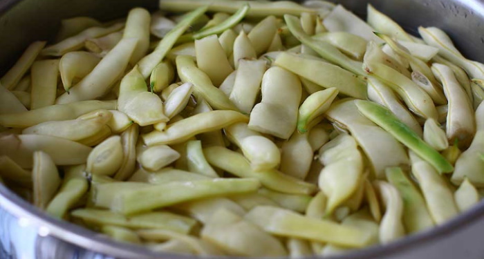 5. Після того як треба відварити овочі і простерилизовали банки, ми можемо починати закладку напівфабрикату. Для цього відкидаємо стручки на друшляк, даємо стекти воді і поміщаємо їх у стерилізовані банки. Не втискивайте овочі занадто сильно, в кожну банку я поклала 370-390 грам стручків квасолі.