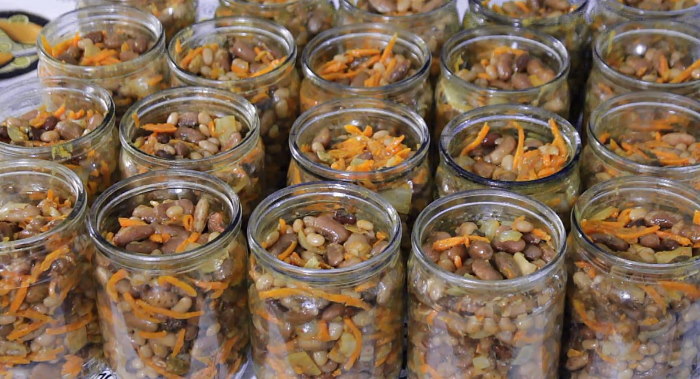 Це смачна і дуже ароматна закуска. Боби квасолі відмінно поєднуються з цибулею, морквою, грибами і помідорами, що надає закуски багатий і дуже апетитний смак. Готуйте цей салат з задоволенням, щоб ви могли насолоджуватися взимку соковитими і ароматними овочами.