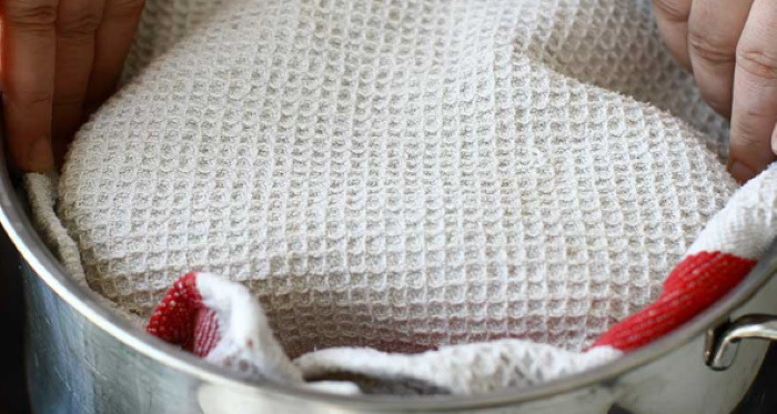 7. Коли заливка буде добре кипіти, а сіль і цукор повністю розійдуться по ній, знімаємо каструлю з вогню, дуже швидко розливаємо сік по банкам з овочами. Склотару щільно закриваємо, ставимо в об’ємну ємність, дно якої застелене тканиною. Заливаємо по плечики гарячою водою, закриваємо кухонним рушником, складеним у два шари. Це запобіжить негайний вихід пари, створюючи ефект низького тиску, достатній для того, щоб температура піднялася вище 100°C. Таким чином, будь-які мікроби будуть нейтралізовані. Як тільки вода закипить, ми стерилізуємо банки на повільному полум’я протягом 30 хвилин, потім вимикаємо вогонь і даємо закуски повільно охолонути всередині каструлі.