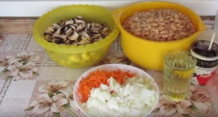 1. Квасоля перебирається, промивається в декількох водах, замочується на 10-12 годин і відварюється в підсоленій воді до готовності. Головне не переварити, щоб боби зберегли свій гарний вигляд. Помиті гриби нарізати тонкими пластинками, цибулю шинкуется, морква натирається.