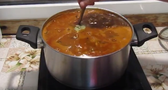 5. Гаряче ласощі розкладаємо по склотарі, прикривають кришками і ставимо в широку ємність для стерилізації. Після того як рідина закипить, засікаємо п’ять хвилин. Потім банки акуратно дістаємо, закатуємо і ховаємо в перевернутому вигляді під товсте ковдру приблизно на десять годин.