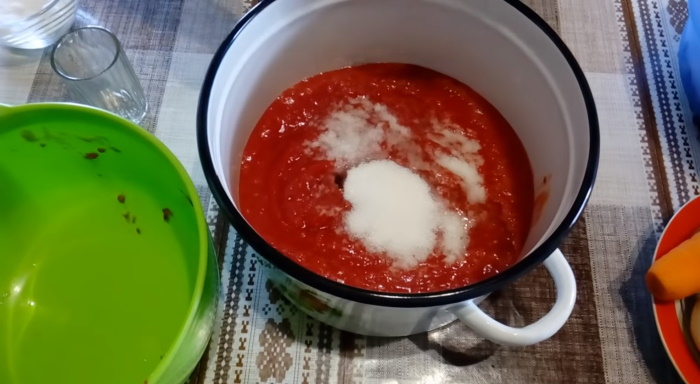 Якщо на ваш смак томатне пюре має надто кислий смак, то, припустимо додати в напівфабрикат приблизно 100 грам цукрового піску.