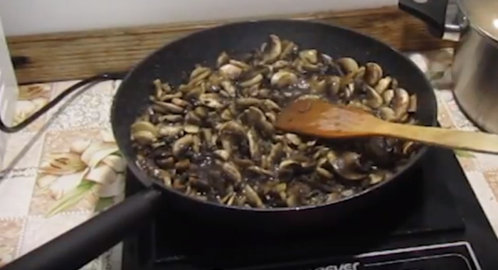 2. В добре прогріту сковороду наливаємо чверть масла від заданого кількості, викладаємо гриби і обсмажуємо до тих пір, поки вода повністю не випарується. В цей час беремо велику жароміцну ємність і перекладаємо в неї відварену квасолю.