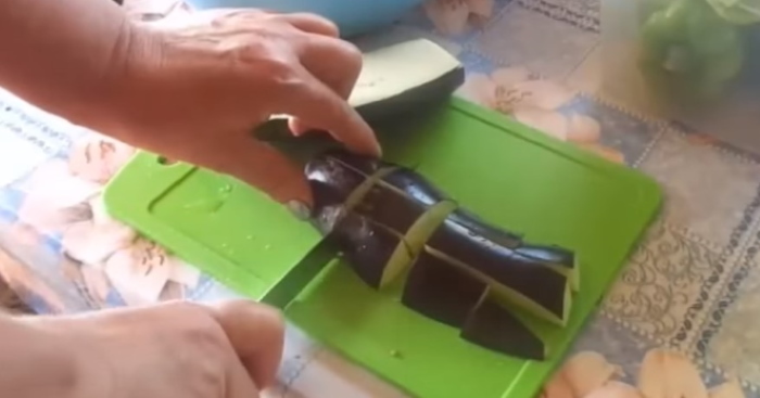1. Баклажани миємо, обтираем паперовим рушником, потім обрізаємо плодоніжку, а м’якоть нарізаємо досить великими шматочками.