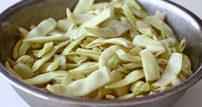 1. Стручки добре промийте в холодній воді. Злийте воду і обломайте кінці. Особисто я обламываю тільки кінчик, де кріпилася плодоніжка, при цьому не чіпаю кінчики стручків, які дуже крихкі. Після того, як ми вимили і очистили квасоля, розрізаємо її на три-чотири частини, за розміром зручні для вживання.