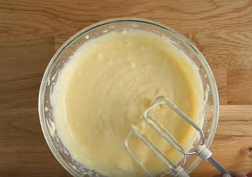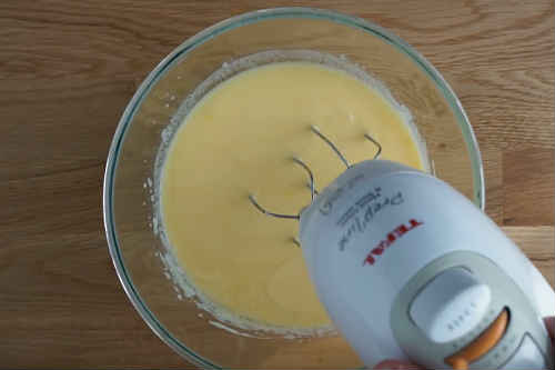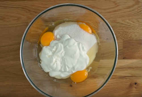 Збийте міксером яйця зі сметаною і цукром. Багато часу не гайте, просто з’єднайте компоненти.