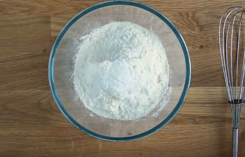 В окремій мисці змішайте сипучі інгредієнти: борошно, сіль, пекарський порошок.