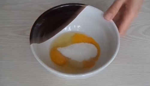 Збийте міксером яйця з цукром. Маса стане трохи пінитися і побіліє.