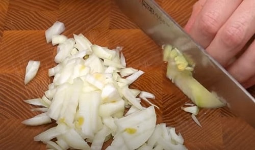 - Викладіть в олію на сковороді дрібно порізану цибулю. Через кілька хвилин додайте помідори, нарізані кубиками.