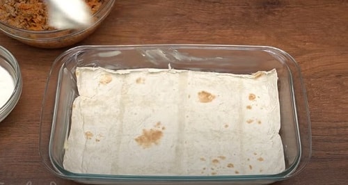 - Промаслите жароміцну форму, поділіть лаваш на три рівні частини.