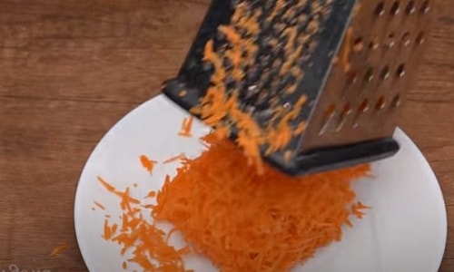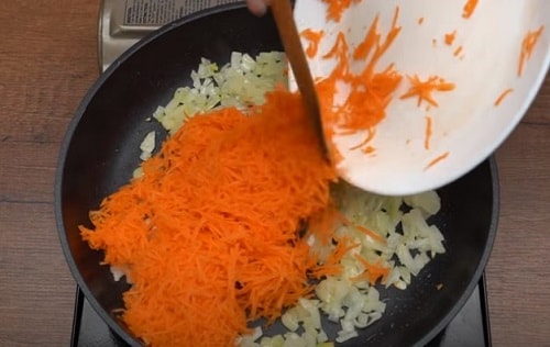 Викладіть на сковороду спочатку цибульну нарізку. Обсмажте до прозорості. Після додайте моркву. Обсмажуйте овочі до красивої рум’яності.