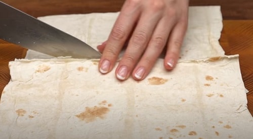 Заміряйте розміри вашої жароміцної форми. Поділіть лаваш на кілька частин, розмірних її діаметру – це приблизно 6 штук.
