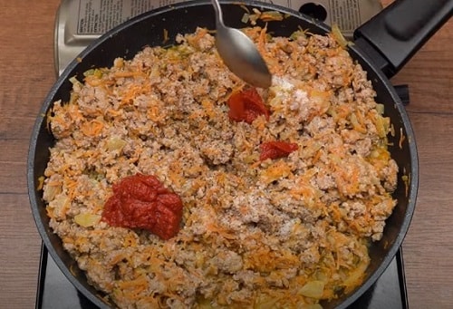 Додайте томатну пасту, перемішайте. Вимкніть конфорку.