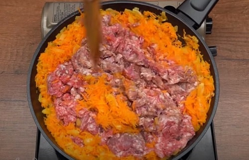 - На окрему сковороду викладіть фарш. Смажте до готовності, розбивши лопаткою великі шматочки на більш дрібні. Посоліть, посипте приправи для фаршу. Коли фарш готовий, з’єднайте вміст обох сковорідок, перемішайте.