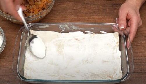 - Покладіть на дно промасленим форми лист лаваша (наріжте цілий лист за розміром).