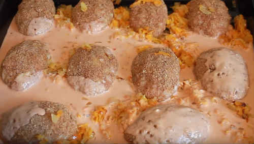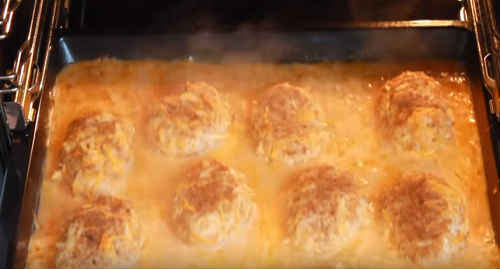 Відправте блюдо запікати при 180 про С. Через 25 хвилин дістаньте деко, переверніть котлетки. Спробуйте соус на сіль, додайте при необхідності. У цей момент в соус можна додати трохи часнику, якщо любите.