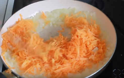 Зробіть зажарку для соусу. Для цього другу половину цибулі закиньте в масло на сковорідку. Обсмажте до м’якого стану. Потріть моркву великої стружкою, відправте до цибулі. Коли овочі зарум’яняться, вимикайте газ.
