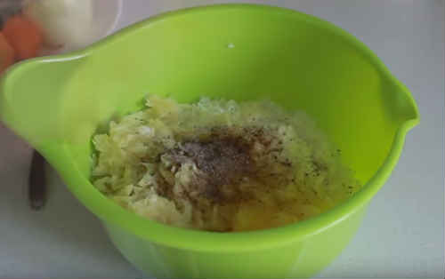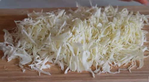 Нашаткуйте капусту. Постарайтеся зробити нарізку максимально дрібної, оскільки не надто приємно, коли капуста виділяється із загальної маси. Раджу трохи перетерти шатківницю руками, страва буде соковитіше.