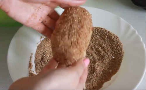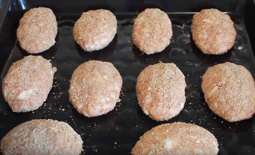 Сформуйте голубці. Візьміть в долоньку достатню кількість фаршу, зліпіть овальну котлету. Обваляйте в паніровці.