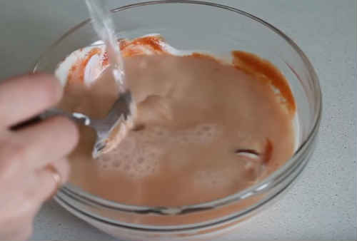 Для приготування підливи в окремій мисці з’єднайте томат зі сметаною. Розмішайте, розведіть склянкою води. Знову перемішайте вміст.