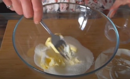 - Розімніть масло природним чином, при кімнатній температурі. Перемішайте з цукром.
