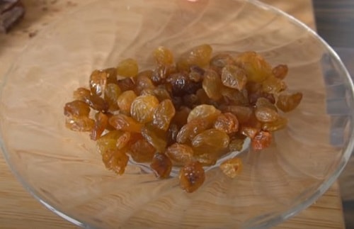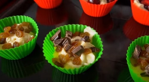 Розподіліть начинку. В половину формочок розкладіть родзинки, іншу половинку заповніть ягодами. Між родзинками і черешнею розкидайте подрібнений шоколад.