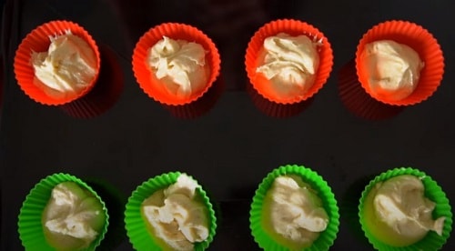 - Розподіліть тестову масу по силіконових формочках. Але спочатку промажте їх маслом і вставте паперові вкладиші.