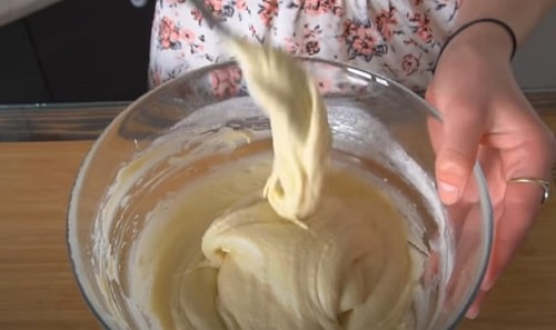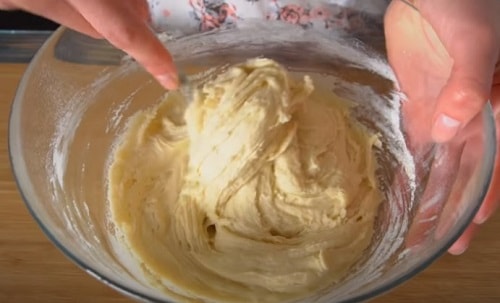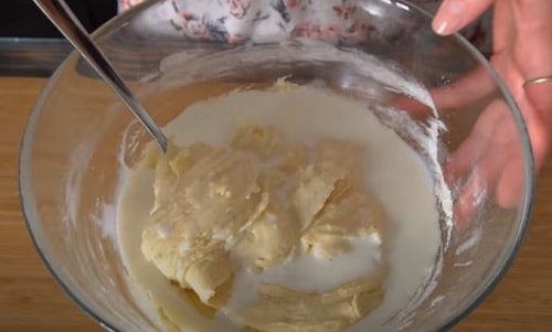 Підсипте в масляну суміш порцію борошна, розмішайте. Потім додайте наступну порцію сухих продуктів, знову старанно попрацюйте, замісивши тісто. На фото видно, якої консистенції має вийти заміс.